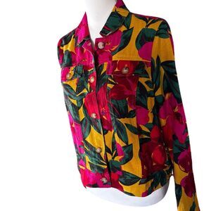 This stunning Tahari jacket features a vibrant floral print in mustard, red, green, hot pink, and black, perfect for adding a bold touch to any outfit. Crafted from a lightweight linen blend, it’s ideal for layering in any season. The jacket is designed with elegant beige buttons and two small front pockets with button closures for added detail.