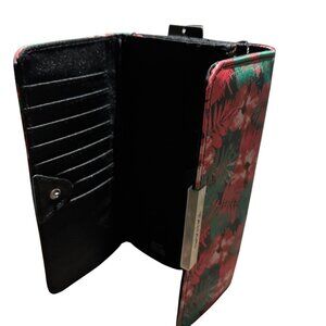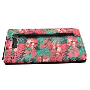 This Tahari clutch wallet features a vibrant floral print on vegan leather with a Saffiano finish. RFID lining ensures secure card protection while offering multiple compartments for organized storage.