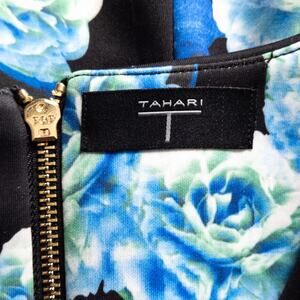 This Tahari sheath dress brings an artfulstatement feel with its black backdrop and waftyflorals in layers of blue and white. Women’s size M. The fabric has a smooth, slightly structured hand that keeps the silhouette clean while still offering a relaxed sophisticated shape. The gold zipper at the back adds a subtle contrast and lifts the look without overpowering the print.