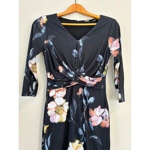 Tahari Floral Twist Front Midi Dress Black Pink Yellow Size 4 Career Party