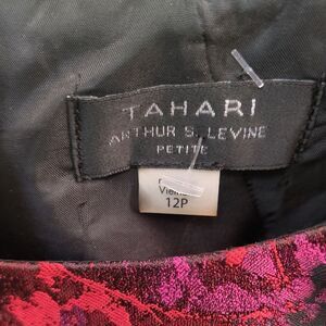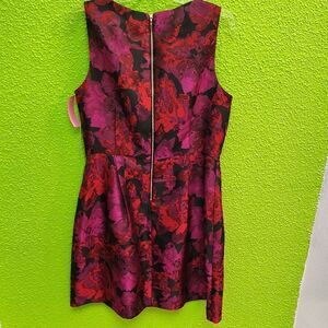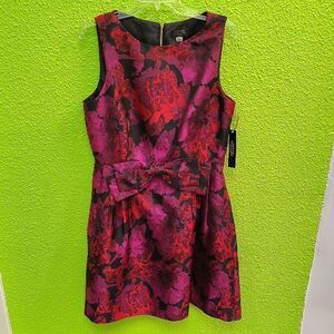 Elegant sleeveless dress with bold floral pattern. Features a stylish bow at the waist. Perfect for any occasion.