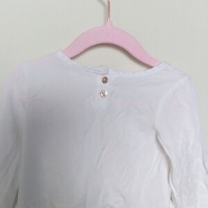Tahari Girl white neutral eyelet lace long sleeve dress with rose gold tone label above the waistband and gold tone buttons at the back of the neck