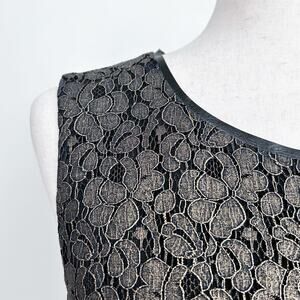 NWT Size 10 T Tahari sleeveless Fran dress. Dark golden metallic lace fabric. Black satin lining. Exposed back zipper. Faux leather trim along the neckline. Very pretty!