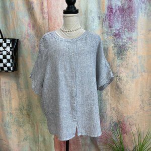 Stylish gray button down shirt. Features short sleeves and a classic collar. Perfect for casual or office wear.