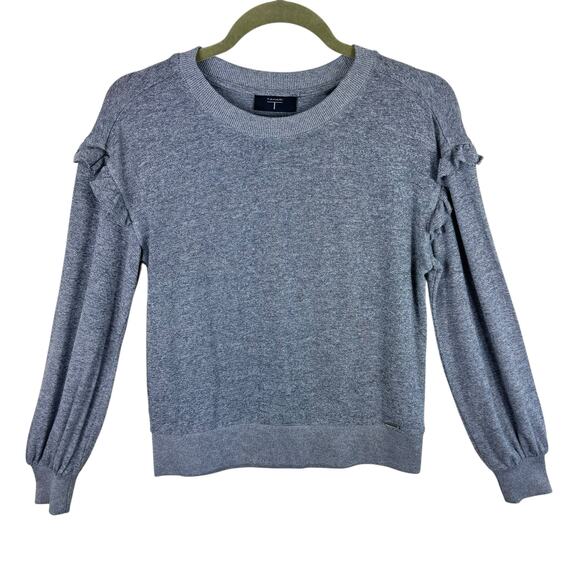 Excellent preowned condition. Gray long sleeve round neck lightweight tight knit stretchy pullover sweater. Ruffled detail on shoulders. Polyester/rayon/spandex material. Approx. measurements: Shoulder to hem 22", pit to pit 20", sleeve from neck to sleeve hem 28". Size S.