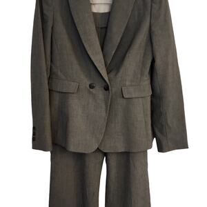 Gently preowned womens gray suit. Two button detail jacket with non functional pockets. Jacket is fully lined