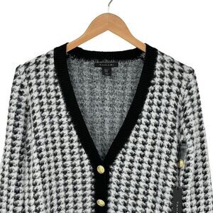 Tahari Houndstooth Eyelash V-Neck Button Up Cardigan Sweater Soft White Black XS