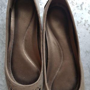 Comfortable leather flats with cutout and stud embellishments. The rubber soles and cushioned insole are perfect for walking or driving. Cute, lightweight and comfortable, not to mention a color that is so versatile to match so many different outfits. Gently worn; in excellent condition.