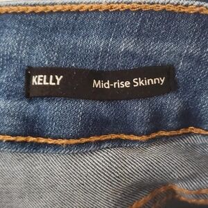 Features : 5-pocket styling, belt loops, zip fly, button closure, mid-rise, skinny jeans, medium wash indigo blue, sanding, whiskering, classic denim, Y2K