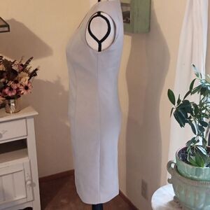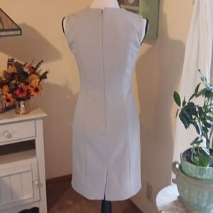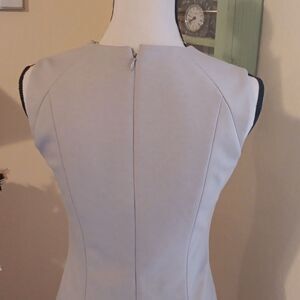 This dress is seamed for a beautiful fit. Light taupe knit. Fully lined. Back zip. Size 2 measures 34 at chest, 28 at waist, 35 at hips. 37 at bottom hem for a perfect pencil shape. 35.5 long from shoulder to hem. A perfect choice for work, a lovely statement.