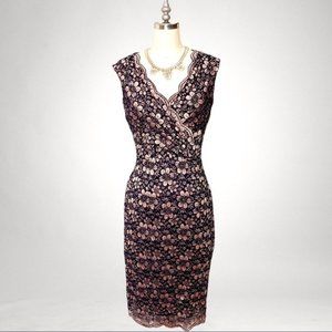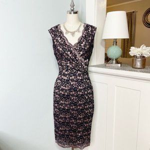 Tahari Lace V Neck Sheath Dress Black & Pink Rose Gold 2 XS