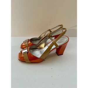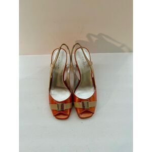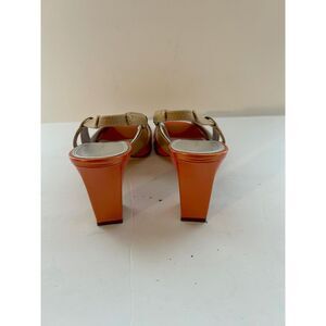 Tahari Leather Open Toe Slingback Sandal Chunky Heels, Orange/Beige, size 7M