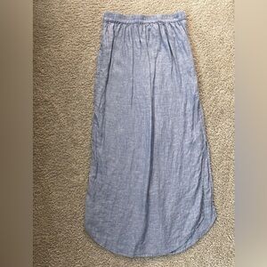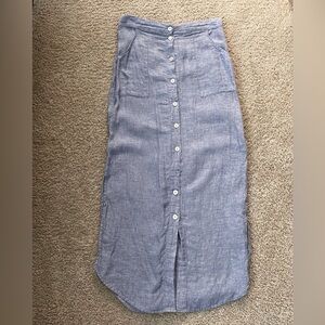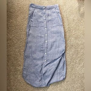 Size medium with pockets linen button down midi skirt in a light blue. There is a button missing as shown in the 3rd photo. The measurements are a 28 inch waist, 36 inch hips and 38 to 39 inches in length.