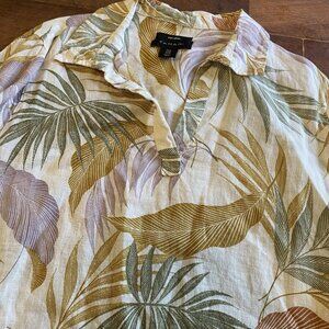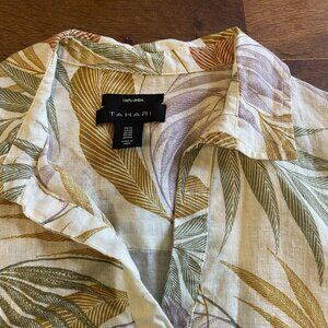 Tahari Linen Top Blouse Womens 1X White Tropical Palms Pullover Beach