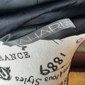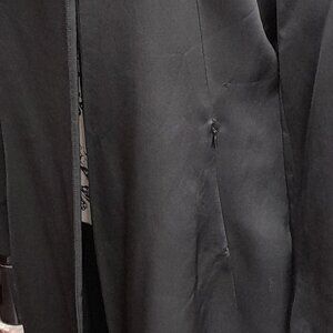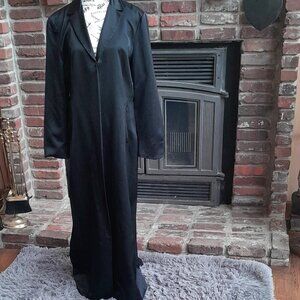 Tahari Long Coat This looks like satin and is gorgeous for any event. Has hook closure, 2 zip pockets and a slit in the back. The wool is 60% and 40% Rayon. Overall Gently loved does have a few small snags but I didn't notice until I was delinting and right up close. The one side of the tag is not tacked.