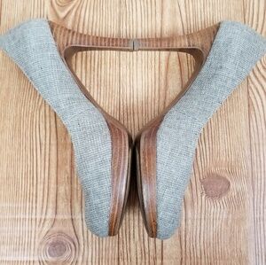 Tahari Lonnie pump. Round toe. Taupe textured fabric. Stacked heel and platform. Size 7.5