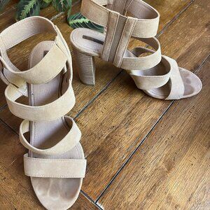 Elie Tahari's Media heels in Tan Suede. This shoe features suede straps with a zipper enclosure and chunky heel. If you are looking for a sandal that's trendy, sophisticated, and chic, then the Media is the perfect match for you. Go from office to nightlife with ease. With a suede leather upper and cool chunky heel, Tahari has got you covered in these block heel strappy sandals.