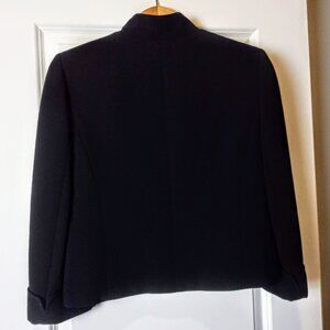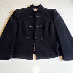 Fully-lined military style solid black blazer from Tahari with stand collar, metal clasp front closures and turned-up cuffs.