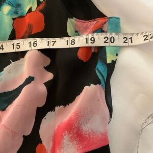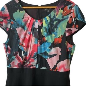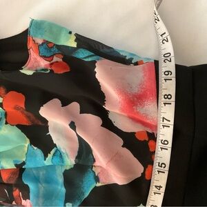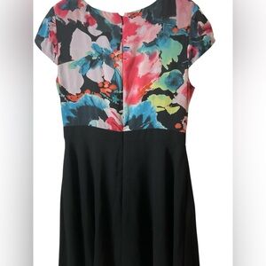 Chic mini dress with a vibrant floral top. Elegant black skirt. Ideal for stylish outings.
