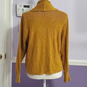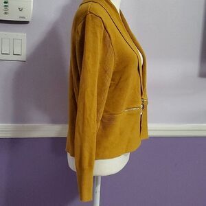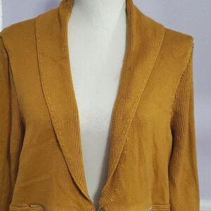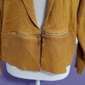 Tahari Mustard Ribbed Knit Zipper Pockets Elegant Lon Sleeve Open Cardigan