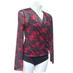 This Tahari bodysuit combines a black and red floral mesh overlay with a sleek design, offering both style and comfort. Ideal for professional or evening wear.