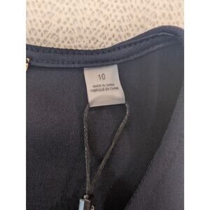 T Tahari sleeveless fit and flare dress in a deep navy blue shade, size 10. This elegant and versatile piece features a scoop neckline, darted bodice, and soft flared midi-length skirt. Made from a structured yet stretchy blend of 69% rayon, 29% nylon, and 2% spandex for a flattering and comfortable fit. Suitable for office wear, business formal events, or simple evening occasions. This piece has clean lines and a modern minimalist design, making it an excellent wardrobe staple.