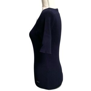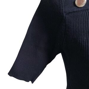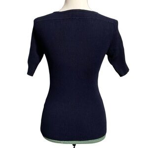 Tahari Navy Ribbed Square Neck Elbow Sleeve Sweater Button Detail Size Small