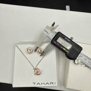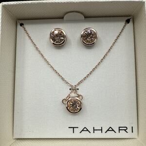 Tahari Necklace Earrings Set Champagne CZ Rose Gold Tone Bezel 18" Chain