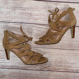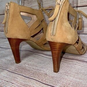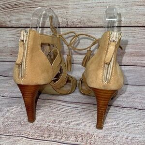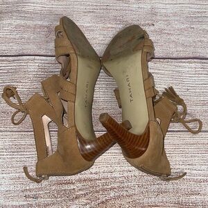 Tahari leather sandals in great pre-owned condition, minor scuff on heel (all signs of wear are in photos). Gladiator lace up heels with zipper back.