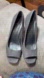 Tahari open toe high heels in a snakeskin animal print with sparkle. These stilletos are a gray taupe mushroom neutral classy color and they have trendy square toes. very nice black wooden heel. Riddle 8.5 M 3 in heel