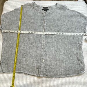 This top is preowned, lightly wear over all. In gray. Oversized small could fit a medium. Dolman sleeves. Slits on the sides. Button up. 100% linen.