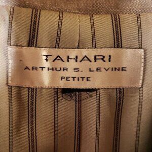 Women’s Tahari Arthur S. Levine petite blazer. Linen, Polyester, & viscose. Great stitching detail on front. Moderate shoulder pads. Good condition except for size tag removed. Measures about a small. Measurements are: 23 ½” sleeve, 25” from shoulder to hem, 15” from armpit to hem, and 21” from armpit to armpit.