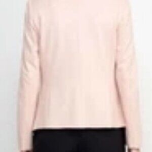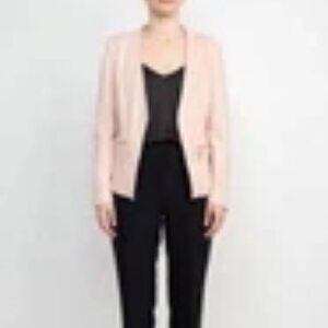 This Tahari blazer in a soft pink hue showcases a tailored fit with a sleek, collarless design. Crafted from a structured fabric, it offers a modern and professional look suitable for various occasions.