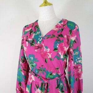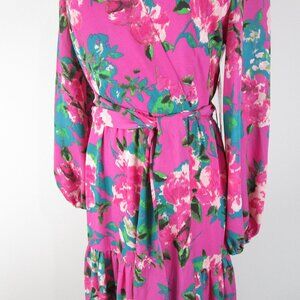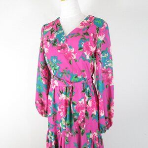 Tahari Pink Green Floral Peasant Boho A Line Long Sleeve Midi Dress Size 4