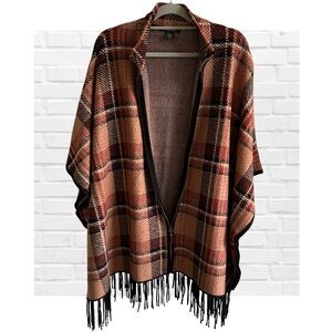 Tahari Plaid Knit Zip-Up Poncho Cape Fringe Brown Black Women’s 2X 3X Plus Size
