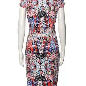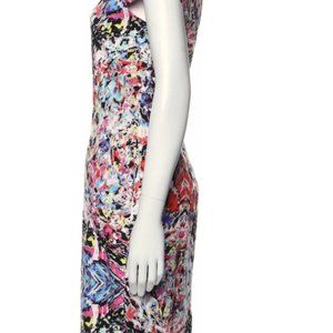 Pink lined, graphic, color printed Tahari dress cap sleeve, reaches mid thigh