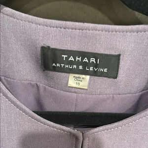 This Tahari blazer in a striking purple shade showcases a sophisticated collarless design with an open front. Crafted from a lightweight fabric, it offers a fitted silhouette that effortlessly transitions from casual to formal occasions.
