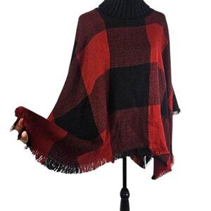 Tahari Red Buffalo Plaid Turtleneck Poncho Fringe Boho Lagenlook Holiday OS