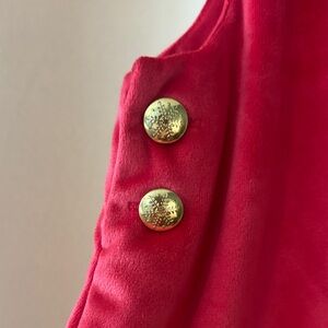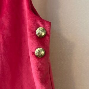 Adorable red pinafore dress with ruffle details. Features gold button accents. Perfect for stylish outings. Soft velvet material