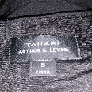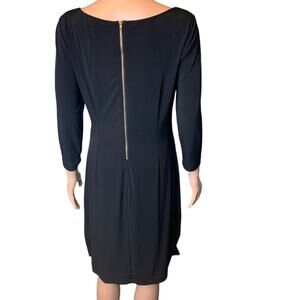This Tahari cocktail dress is the perfect little black dress. Ruched to the left side, with a gold buckle and back gold zipper closure. Scoop neck, 3/4 sleeves. 95% polyester, 5% Spandex, polyester lining, dry clean. Retailed for $118. Wardrobe basic for a wide variety of occasions from semiformal cocktail parties, hoiday gatherings or weddings, to more somber occasions.
