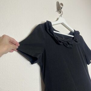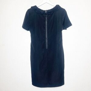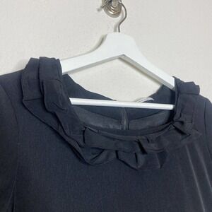 Gorgeous dress by Tahari. Black sheath dress with a ruffle collar that goes all the way around the neck. Silver center back exposed zipper. Lined. So pretty and classy! PLEASE NOTE: Size tag has been removed but seems to be in line with a S. Please refer to measurements which are approximate, taken flat and closed.