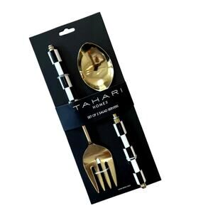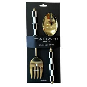 Tahari Salad Serving Spoon Fork Set of 2 Black & White Checkered Gold Glam New