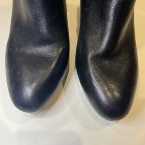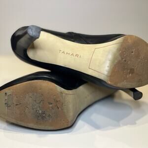 Black leather with leopard print pony hide back Tahari Serena bootie. In good used condition. Minor wear on bottom of toe areas and soles.