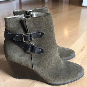 Tahari Sharon Wedge Booties. Beautiful olive green suede with brown strap detail. Well made. Excellent condition with minor sign of wear. There seems to be little to no wear on bottom of shoes. The minor distressing on the boot may be the look the boot from manufacturer. 3 inch heel. Size 6.