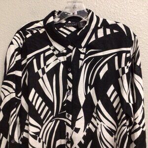 Tahari Shirt Womens Black White Print Linen Blend Button Up Blouse Top Sz Large