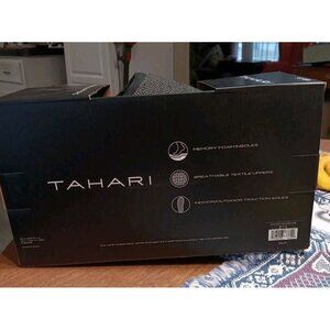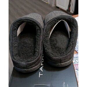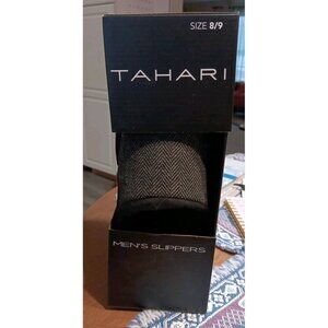 These are men's Tahari slippers in size 8/9, featuring a black with grey herringbone pattern. They have a slip-on style with a round toe and synthetic outsole. The slippers are lined with faux fur and have memory foam for added comfort. Suitable for winter, summer, fall, and spring seasons. The upper material is a blended fabric with a textile lining.