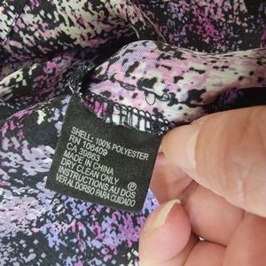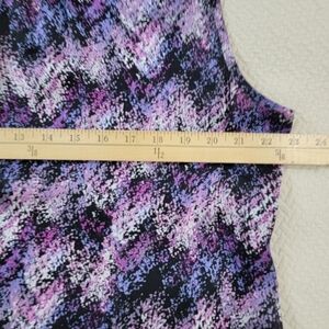 This sleeveless blouse showcases a dynamic multicolored purple and lavender pattern with a relaxed fit. Its light and airy fabric makes it an ideal choice for warm weather or as a stylish layering piece. The contemporary design and flowing silhouette offer both comfort and style. pleated neckline. Button closure at back.