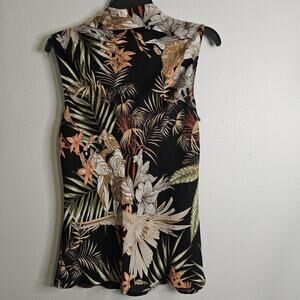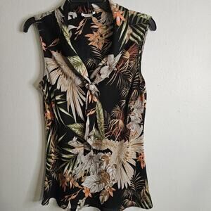 Tahari Sleeveless Collared Floral Birds Print Chiffon Blouse Dressy Casual Sz M