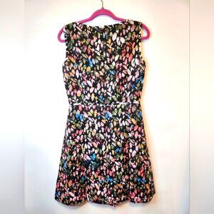 Size 6 Black with colorful, floral leaf design Lined. armpit to armpit 18" length 38" waist 15"