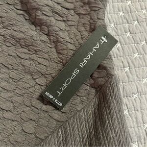 Tahari Sport sweatshirt has patterns of cheetah print and stripes. Hoodie has a built in mock turtleneck. Features drawstring, thumb holes and Tahari logo charm on front bottom.